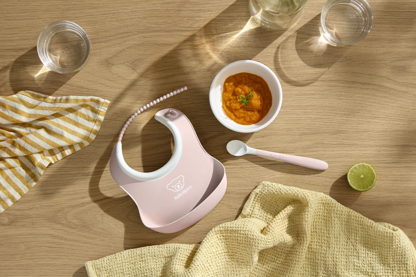 Solidna miseczka dla niemowląt, którą można łatwo trzymać podczas karmienia. Łyżka do karmienia z praktyczną długą rączką. Mały śliniaczek z wyjątkowo miękkim dekoltem.