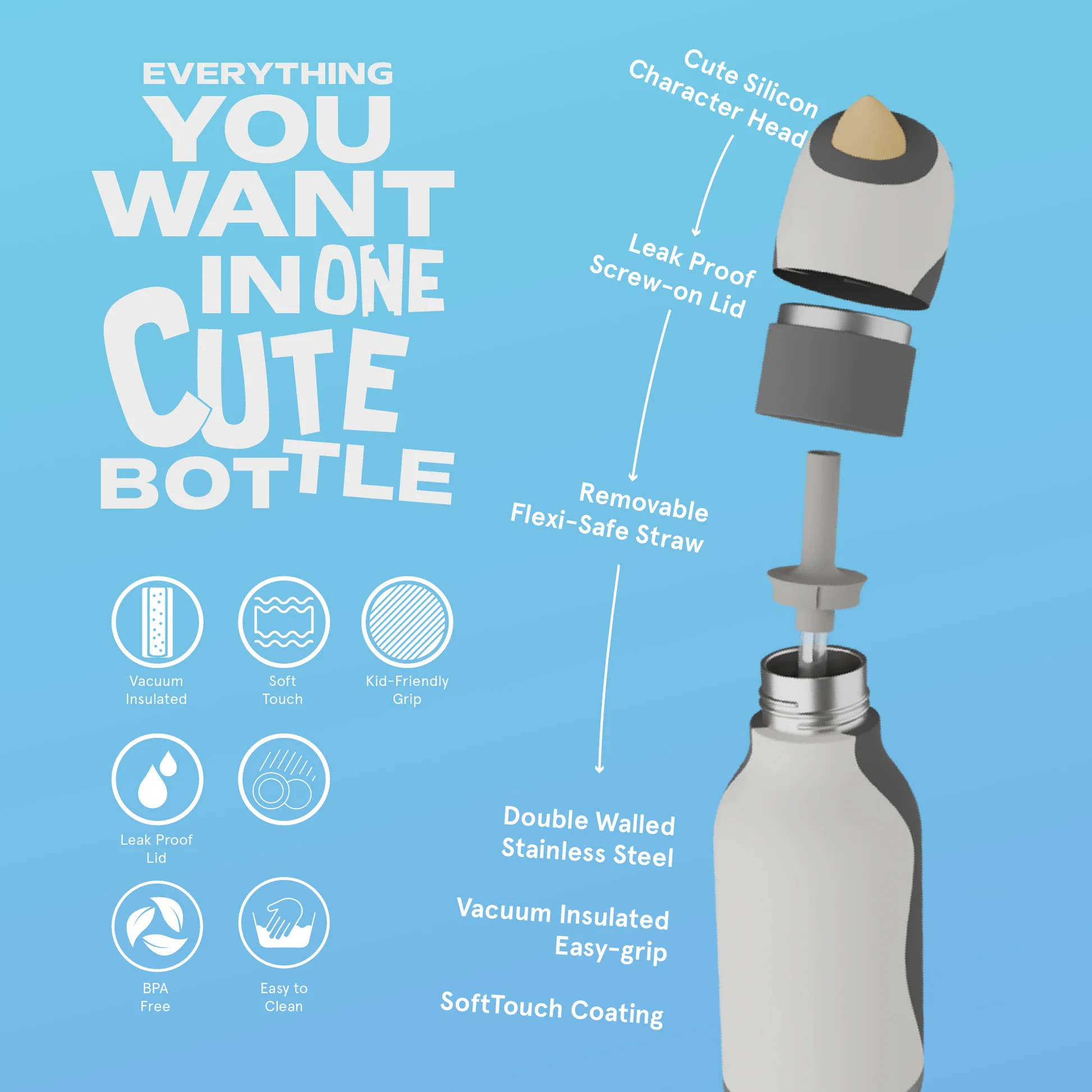 - Zintegrowany uchwyt: Praktyczny pierścień przy głowie pingwinka ułatwia przenoszenie butelki w dłoni lub przypięcie jej karabińczykiem do wózka.