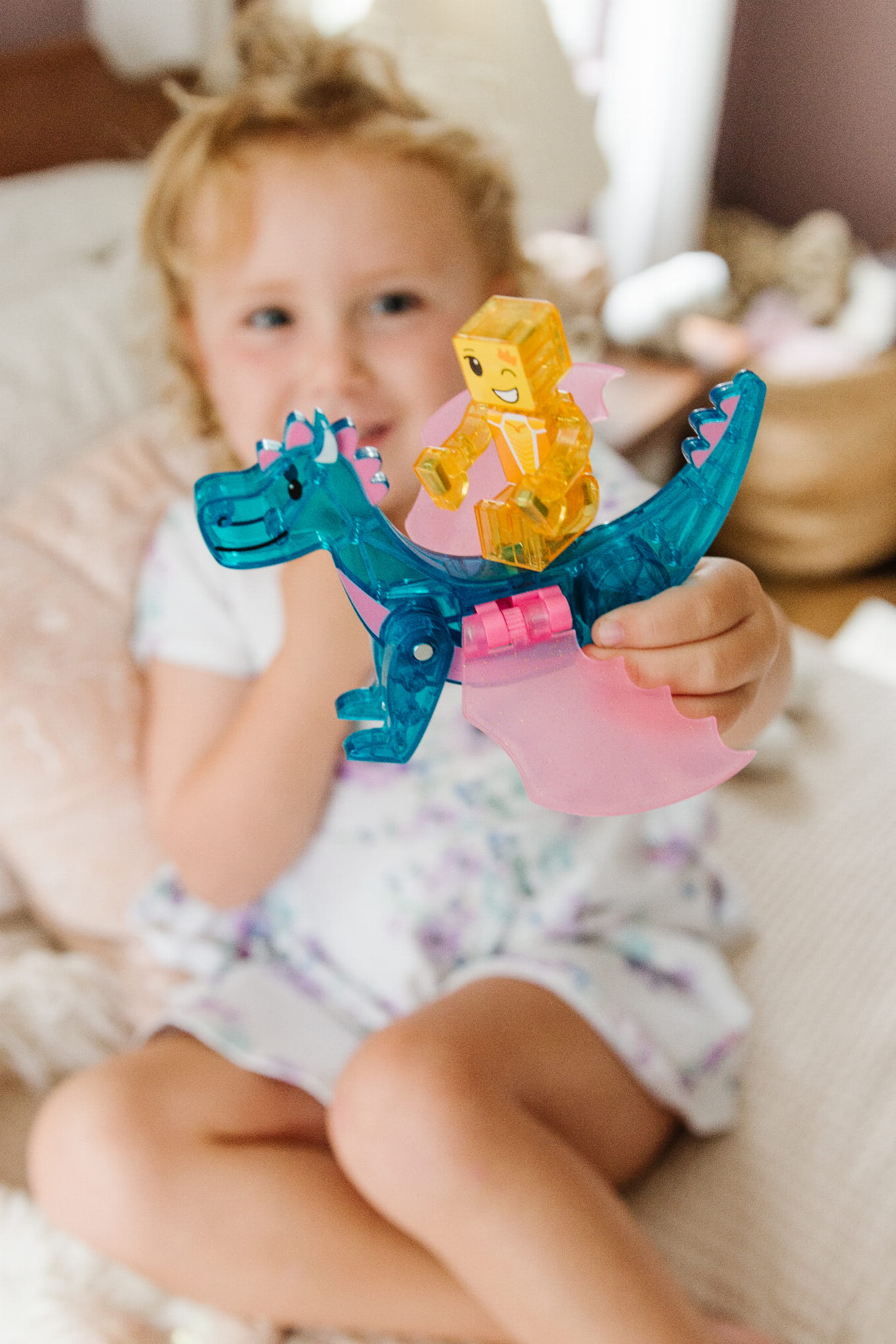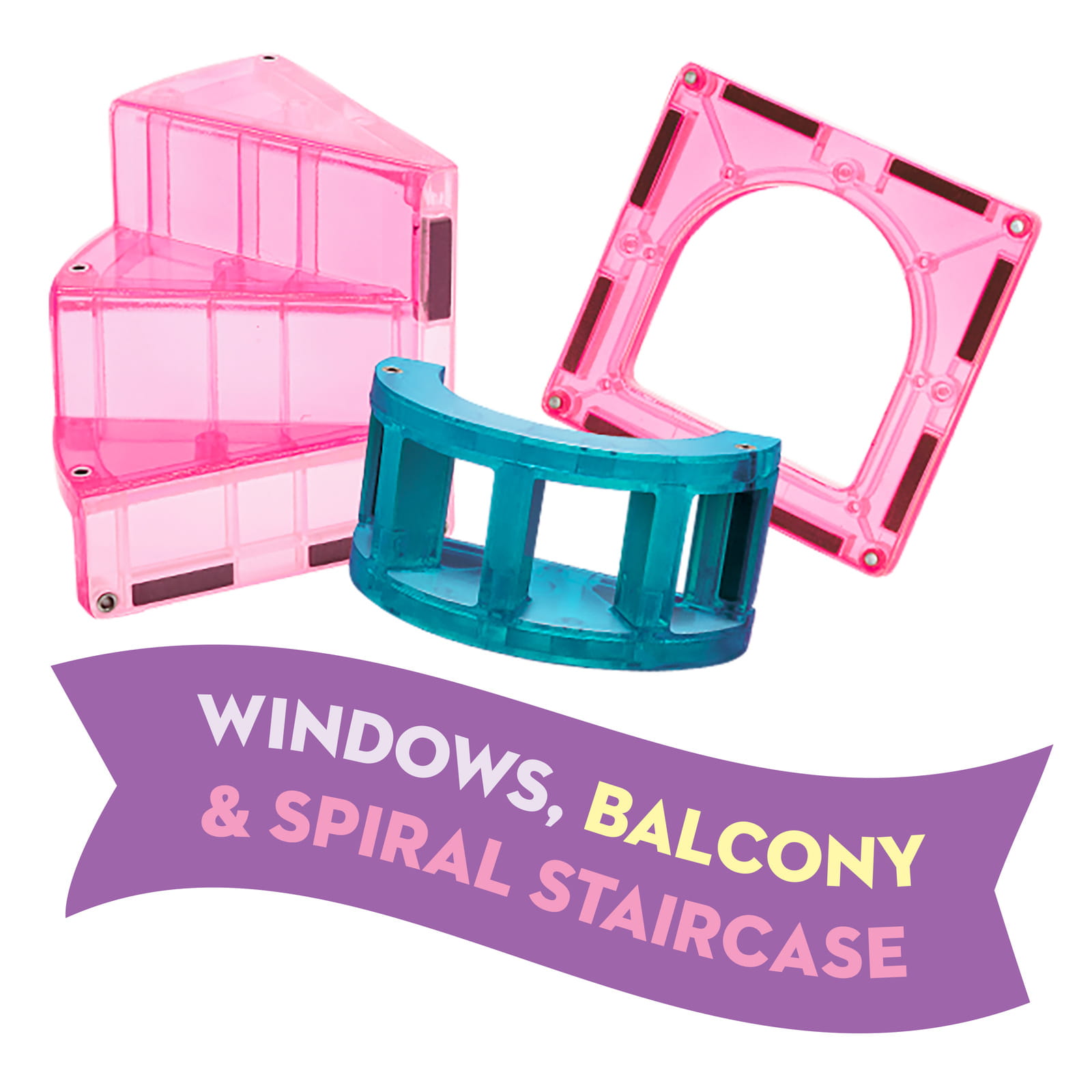 Zestaw MAGNA-TILES® Zamek pozwala dzieciom przenieść się do świata bajkowych przygód. Otwórz most zwodzony, wspinaj się po spiralnych schodach, baw się balkonem i figurką smoka. Brokatowe płytki i okna dodają zabawie uroku i pozwalają na kreatywne opowiadanie historii
