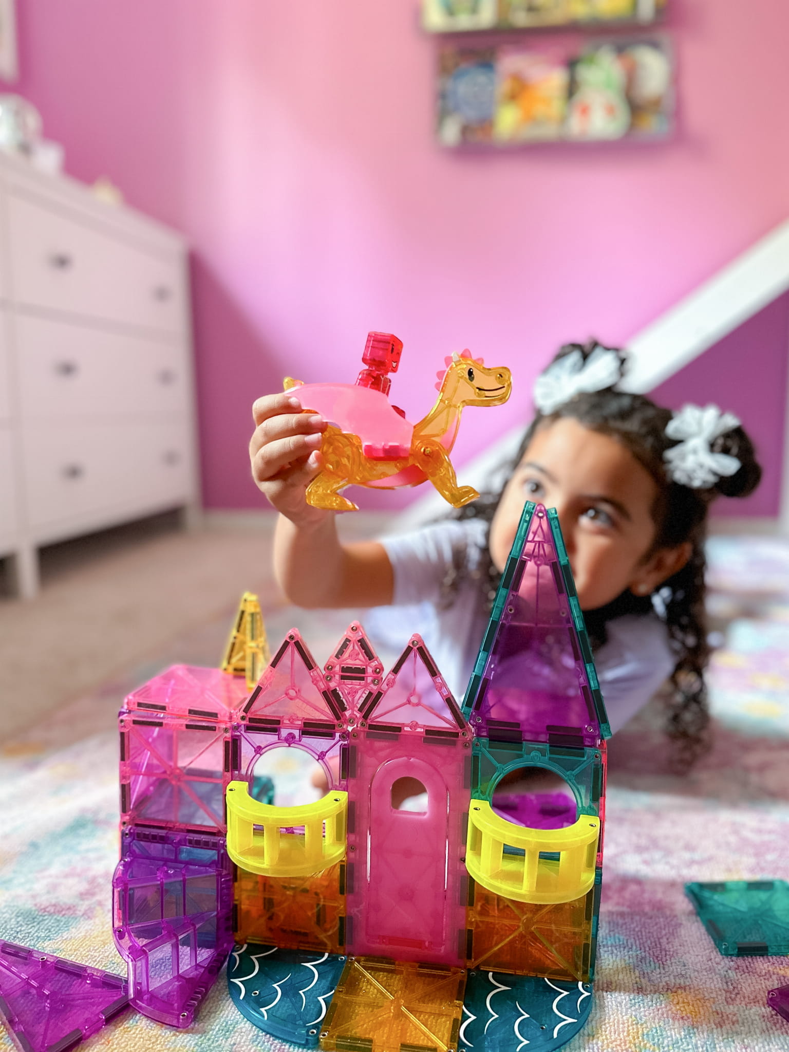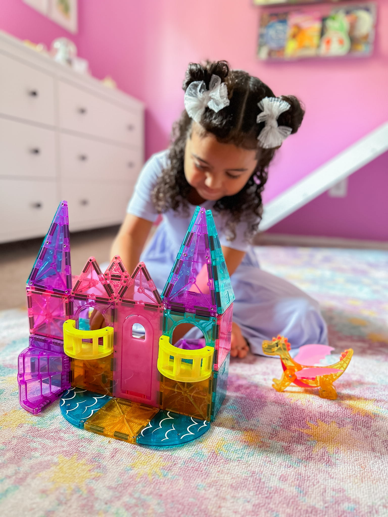 Zestaw MAGNA-TILES® Zamek DLX przenosi dzieci w świat fantastycznych przygód. Otwórz most zwodzony, wspinaj się po spiralnych schodach, stwórz balkon i baw się figurkami smoka oraz królewskiej postaci. Elementy microMAGS oraz błyszczące płytki dodają zabawie niezwykłego uroku i pozwalają na kreatywne opowiadanie historii.