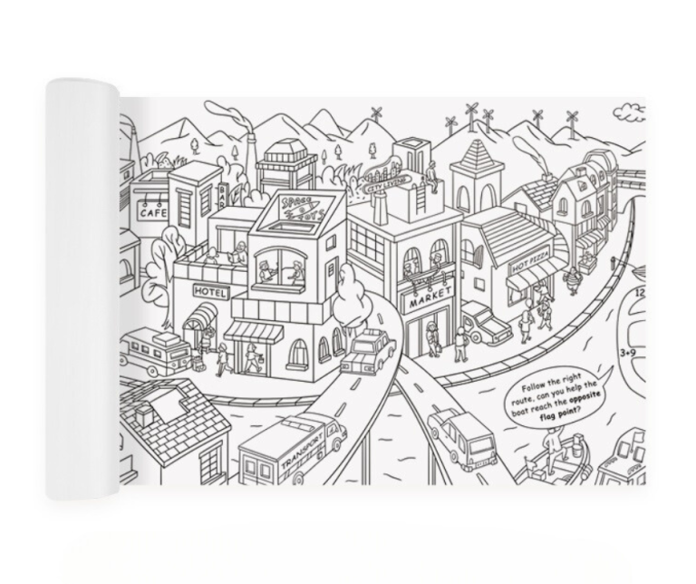 Długa kolorowanka to gwarancja wielogodzinnej zabawy! 10 metrów ilustracji przedstawiających tętniące życiem miasto pozwala dziecku nadać każdemu zakątkowi własne barwy. Dzięki dużej powierzchni maluch może tworzyć wyjątkowe, różnorodne krajobrazy, rozwijając przy tym wyobraźnię i kreatywność. Miasto na pewno nie będzie jednolite – można je projektować razem, tworząc miejsce, w którym moglibyście mieszkać lub spędzać rodzinne wakacje.