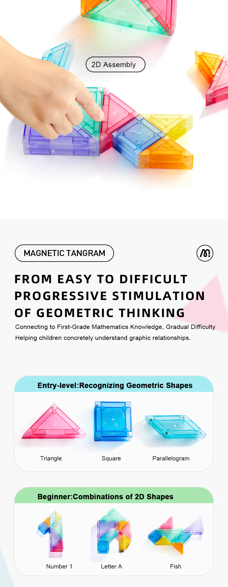 Z prostych kształtów dzieci mogą tworzyć różnorodne formy, ryby, łabędzie, literki i wiele innych, ćwicząc spostrzegawczość i refleks. Lakierowane, kolorowe elementy przyciągają wzrok i zachęcają do zabawy.