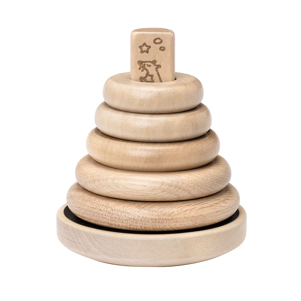 Autentyczna, drewniana zabawka posiada wygrawerowane detale w zabawnych ilustracjach z małą myszką wspinającą się wzdłuż kija. Pierścienie można układać w dowolnej kolejności, a podczas zabawy dziecko zyskuje poczucie, jak różne rozmiary mają się do siebie nawzajem. Który pierścień jest największy, najmniejszy, a który jest po środku? Odkrywajcie i bawcie się razem!