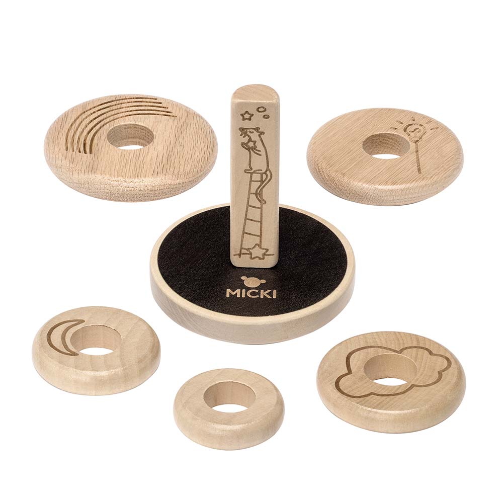 Seria produktów Micki Premium cechuje się wyraźnym drewnem z mieszanką różnych gatunków drewna. Naturalne zmiany w materiale sprawiają, że każdy produkt staje się unikalny i osobisty. Wygrawerowane ilustracje zabawek działają jak książka z obrazkami, tworząc kontury, które dziecko może dotykać i doświadczać. Inspirują do ciekawego opowiadania historii i sprawiają, że więcej zmysłów jest używanych podczas zabawy dziecka. Historia nabiera kształtu w grze - gdzie idzie mysz? Każdy pierścień to historia, którą dziecko może odkryć podczas zabawy. Klasyczne zabawki o autentycznym drewnianym uczuciu, które staną się niezapomnianą częścią zabawy dla małych ciekawskich dzieci!