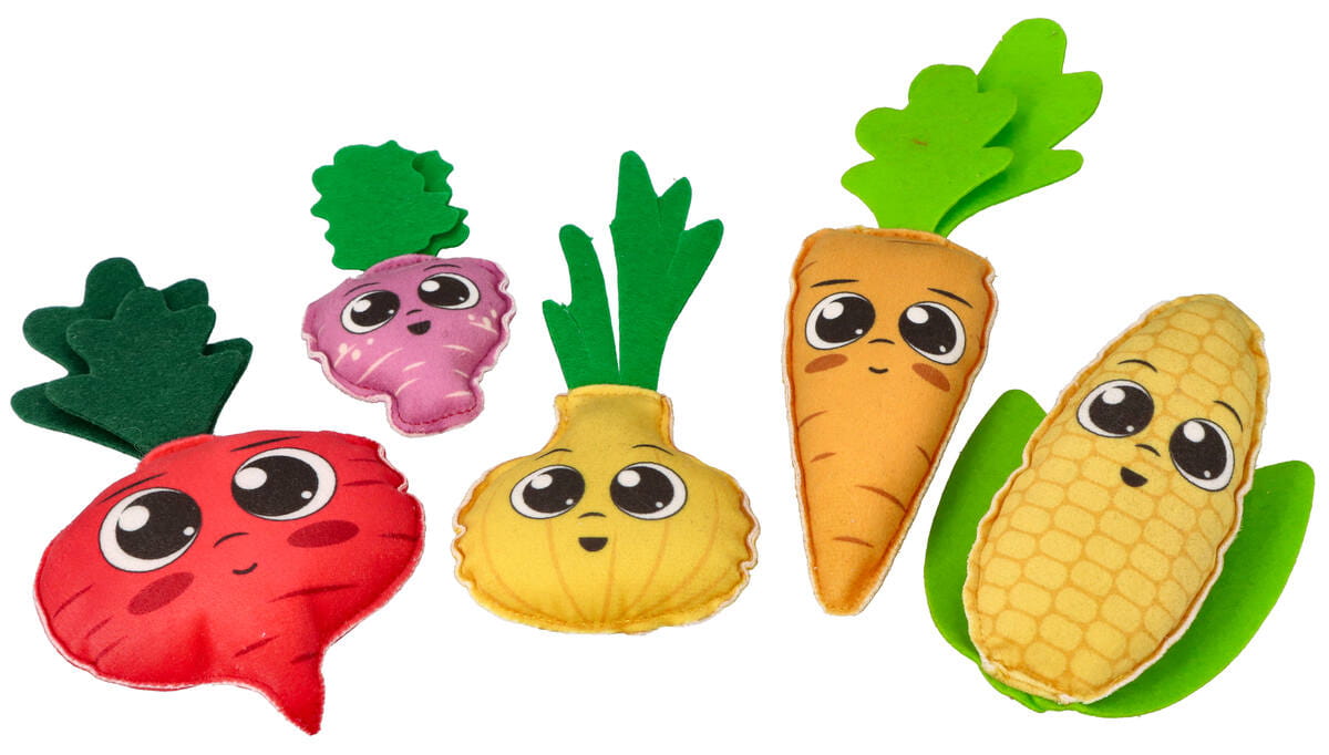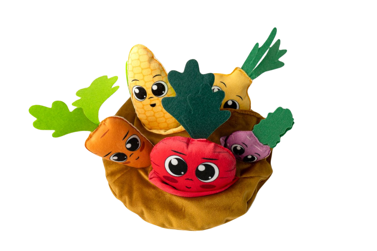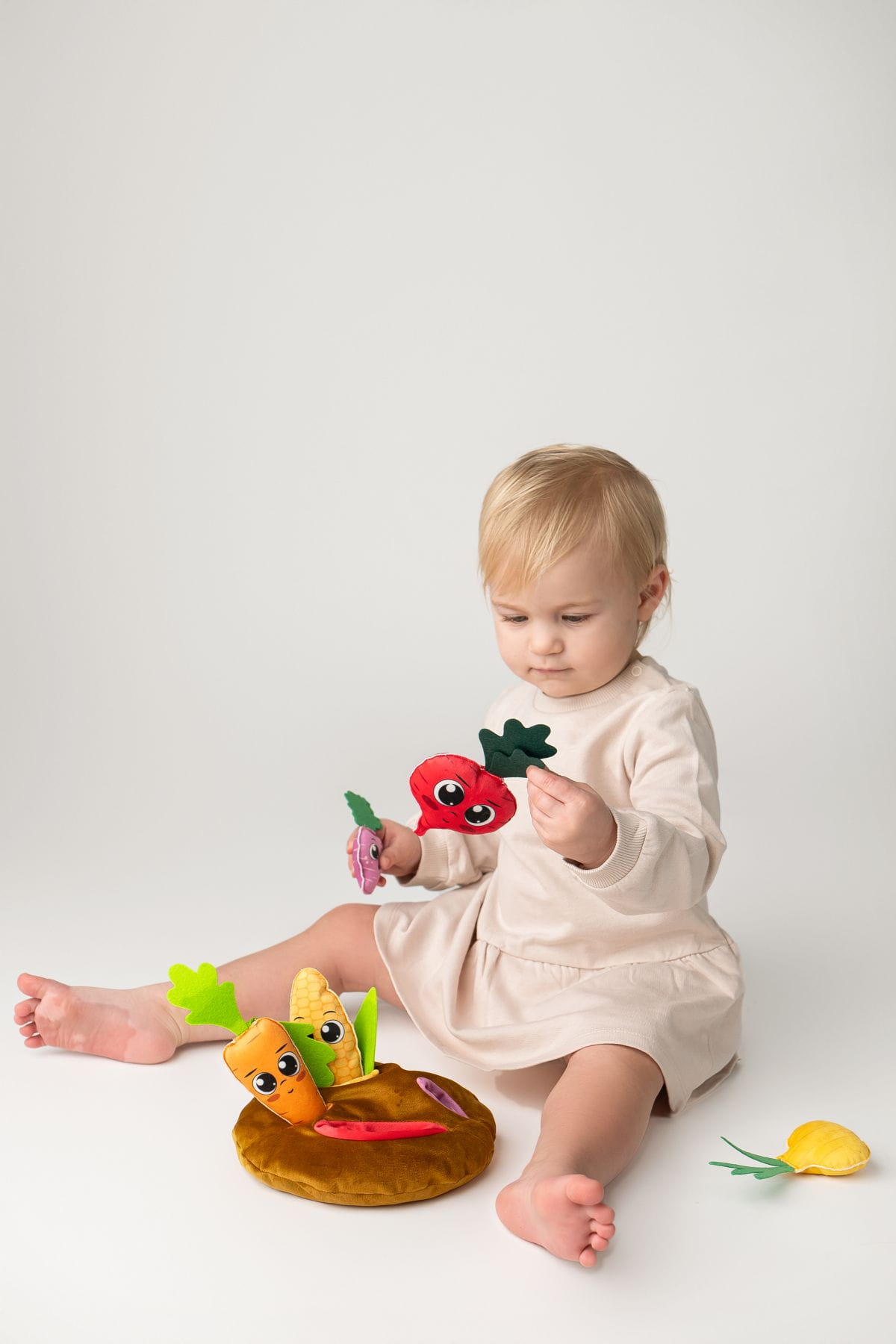 Ogródek Warzywny to urocza zabawka sensoryczna dedykowana dzieciom powyżej 9 miesiąca życia, stworzona z milutkiego weluru, zapewniającego dziecku przyjemne doznania dotykowe. W zestawie znajdują się 5 uśmiechniętych warzyw o różnych kształtach i kolorach, oraz kolorowy kopiec z dziurkami, uszytymi w tych samych kolorach co warzywa. Dziecko ma za zadanie posadzić warzywo w odpowiedniej dziurce na grządce, co rozwija jego małą motorykę oraz doskonali koordynację oko-ręka.