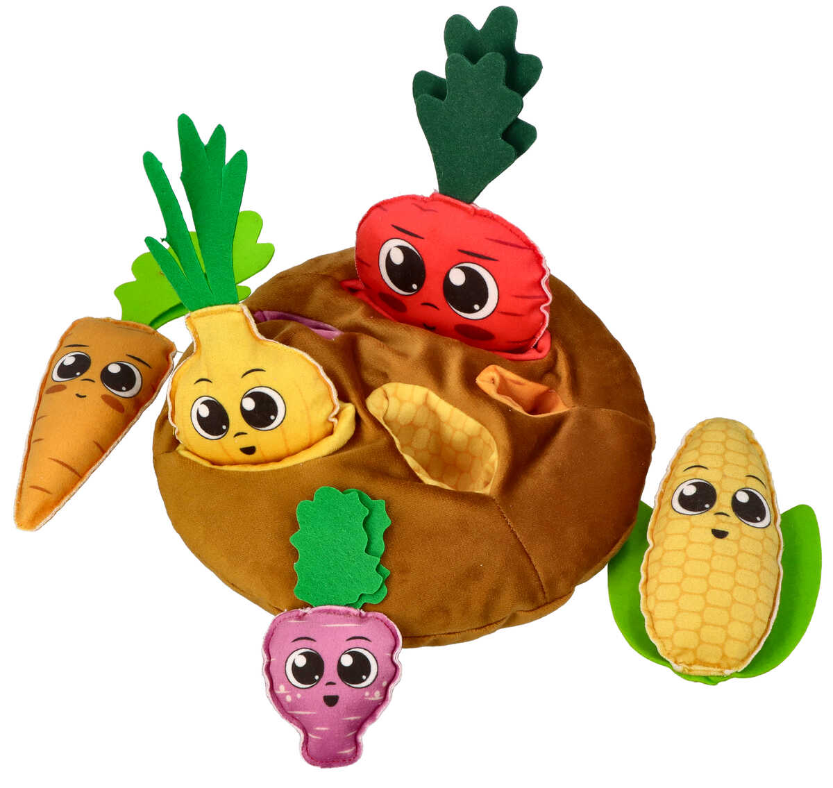 Kopiec wypełniony jest łuską gryki, która dzięki swoim naturalnym właściwościom, przypomina proces sadzenia w prawdziwej ziemi. Poprzez zabawę Ogródkiem Warzywnym maluch uczy się rozpoznawania kolorów oraz rozwija zdolności manualne. Uśmiechnięte warzywa, które są częścią zestawu, nie tylko wprowadzają element zabawy, ale także stanowią zachętę do eksploracji i odkrywania świata.