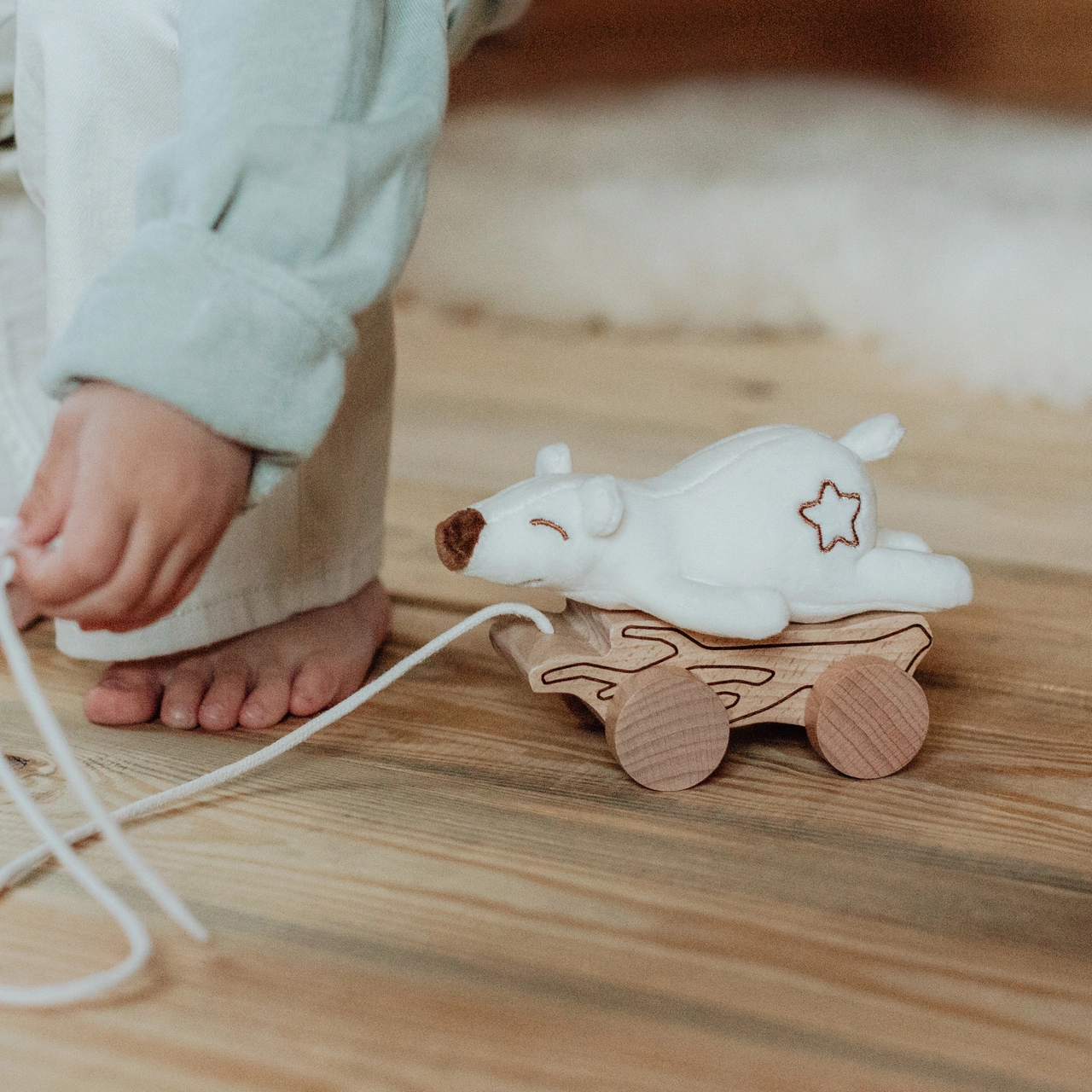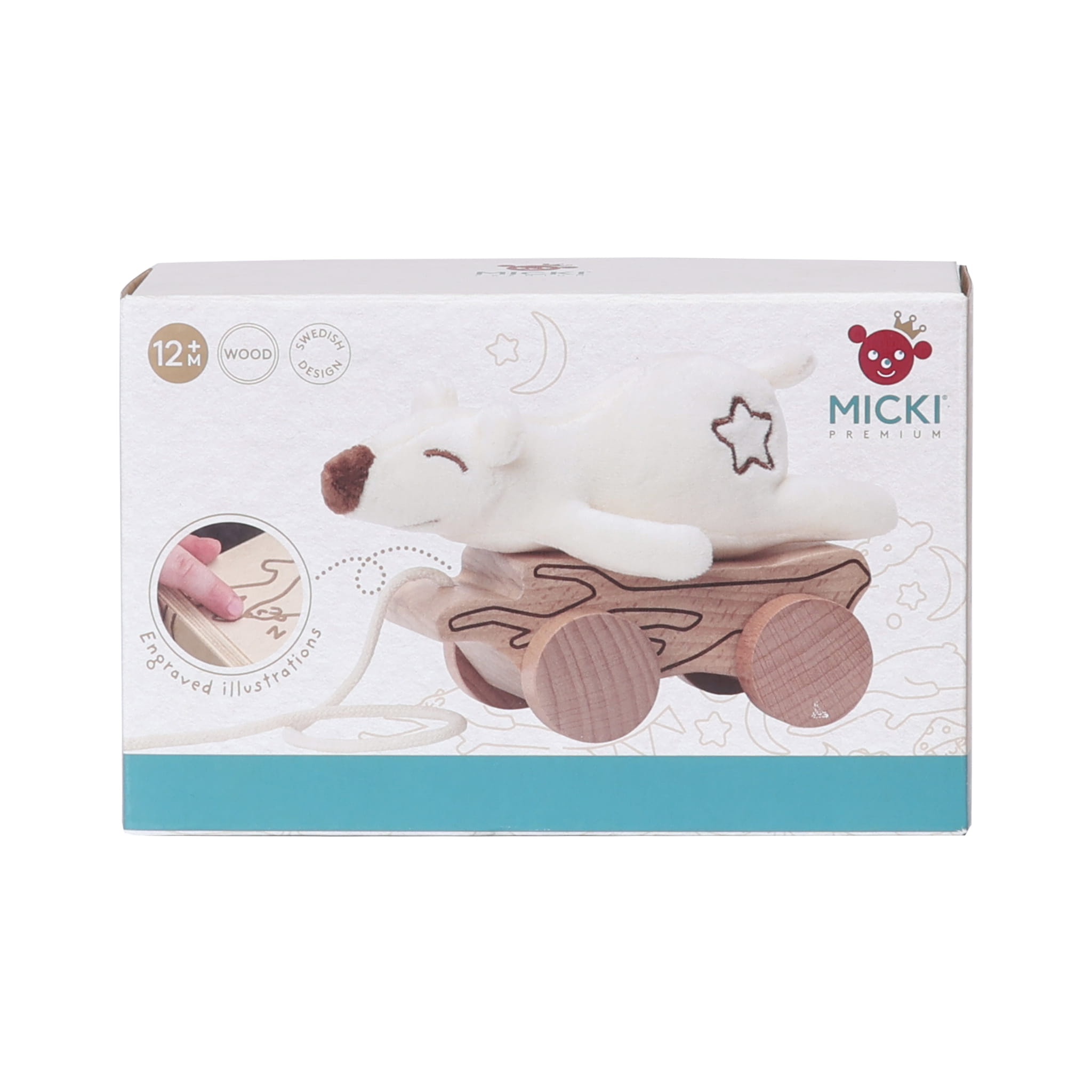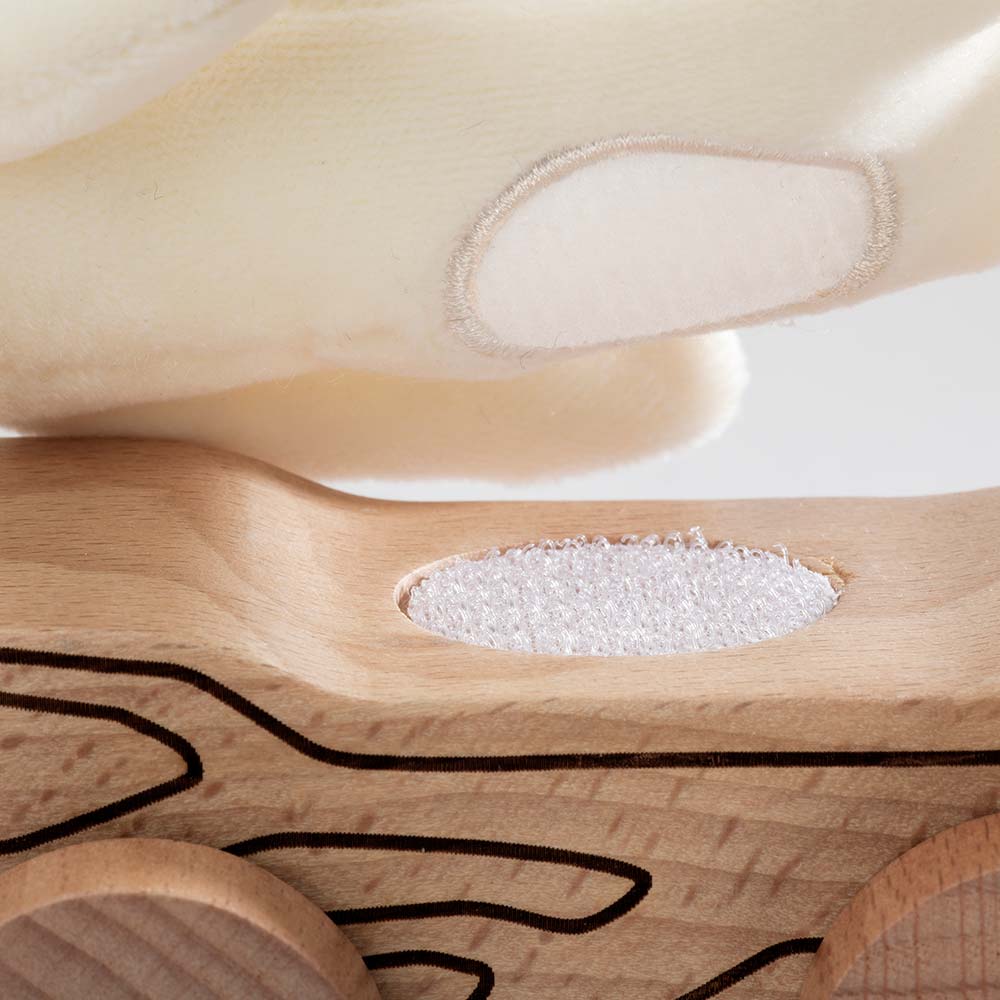 Miękki miś na drewnianej, grawerowanej podstawie. Misia można zdjąć i założyć za pomocą mocowania na rzep. Ma wyhaftowaną gwiazdkę na grzbiecie. Misia można przytulać a zabawkę ciągnąć po całym pokoju.